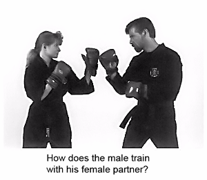The male student's training is also improved by his female partner's use of protective equipment. With protective equipment, the male partner has the freedom to attack and strike the same targets on his female partner that he would on another male (again, his most likely assailant). Without protective equipment, his training loses realism.